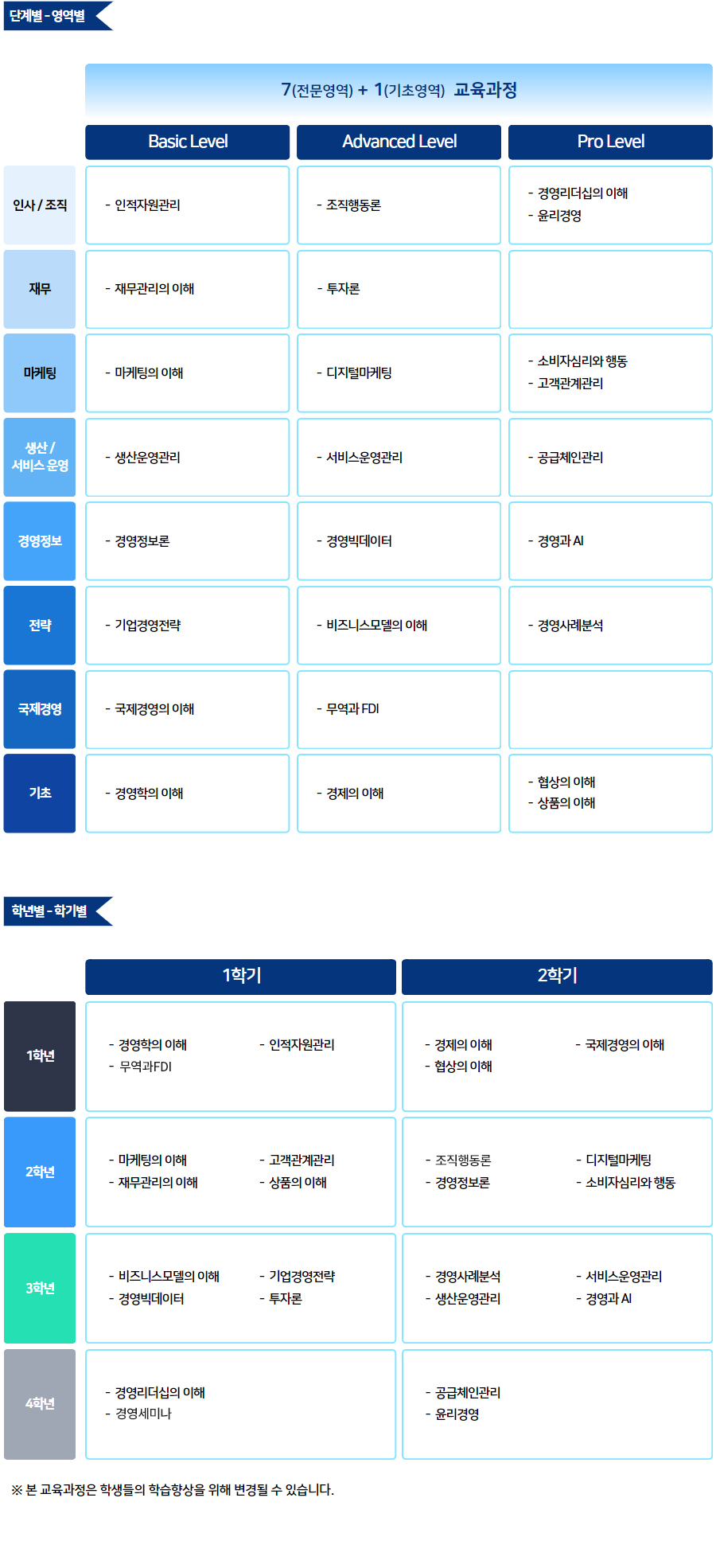 | 3학년 | 1학기 | 비즈니스모델의 이해, 경영빅데이터, 기업경영전략, 투자론 |