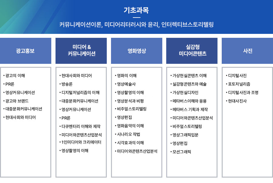기초과목(커뮤니케이션이론, 미디어리터러시와 윤리, 인터렉티브 스토리텔링)