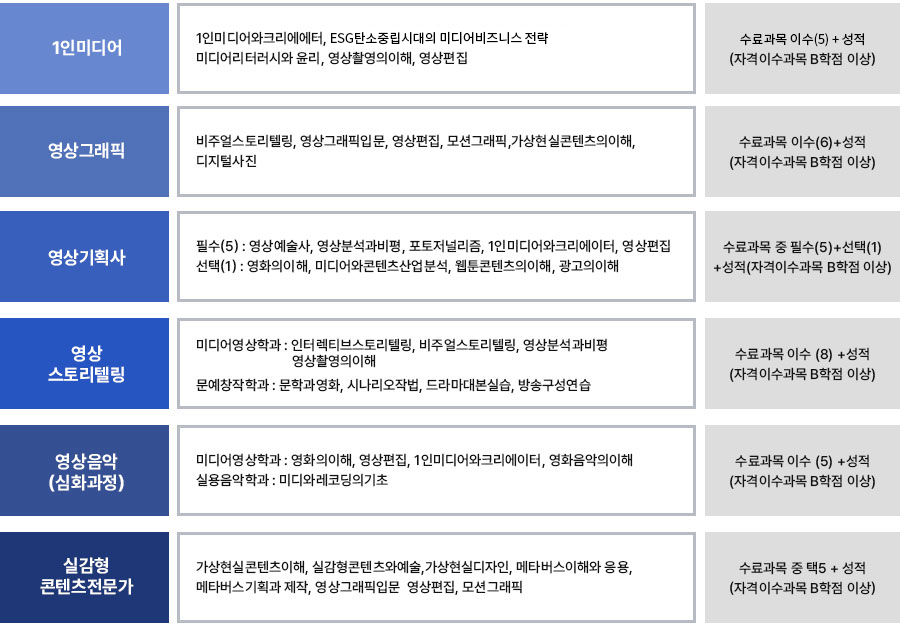 선택(1): 영화의이해, 미디어와콘텐츠산업분석, 웹툰콘텐츠의이해, 광고의 이해 - 수료조건 : 수료과목 중 필수(5)+선택(1)+성적(자격이수과목 B학점 이상)